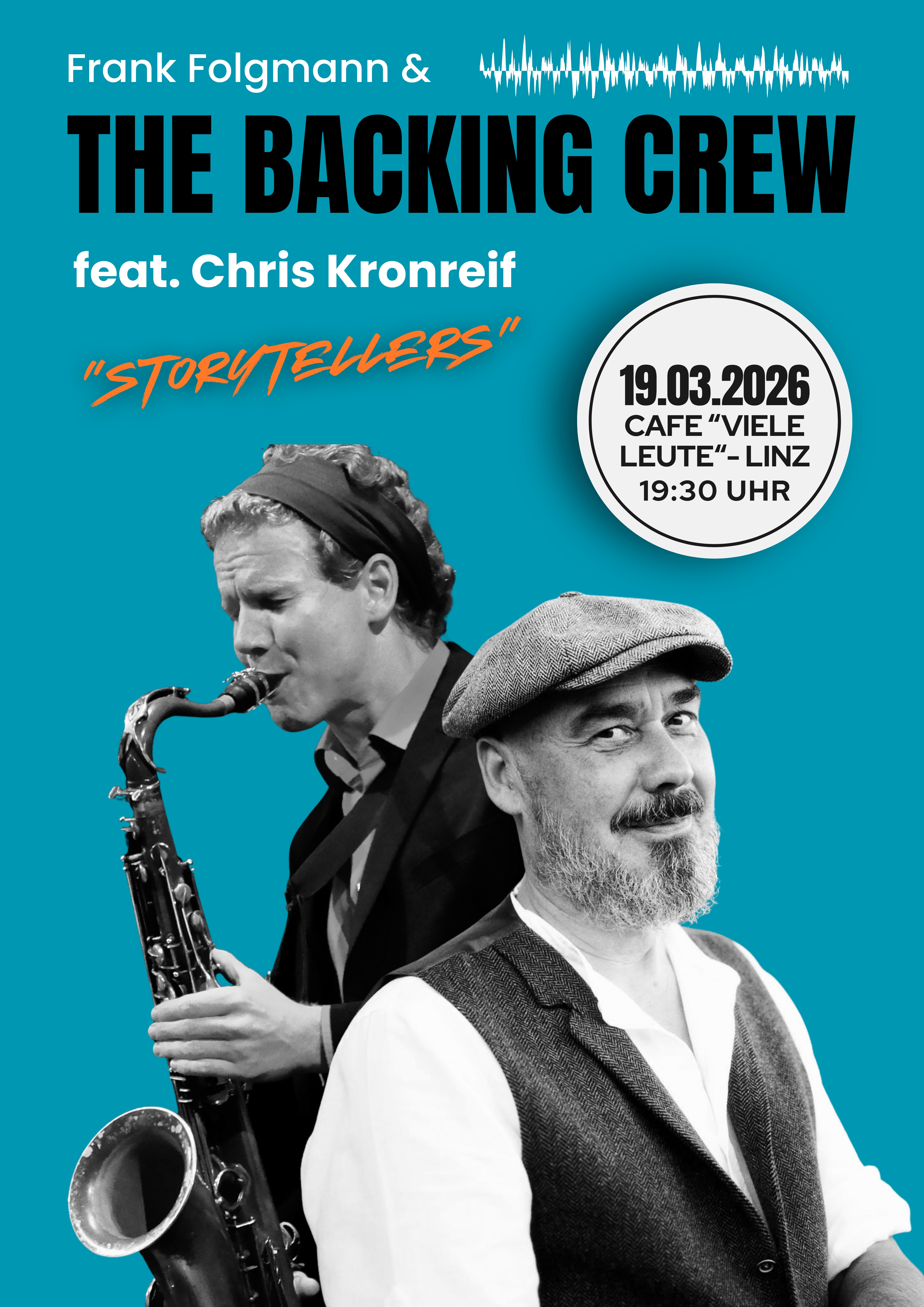 Frank Folgmann & The Backing Crew präsentieren an diesem Abend, ihr Programm „STORYTELLERS“ mit Chris Kronreif am Saxophon.